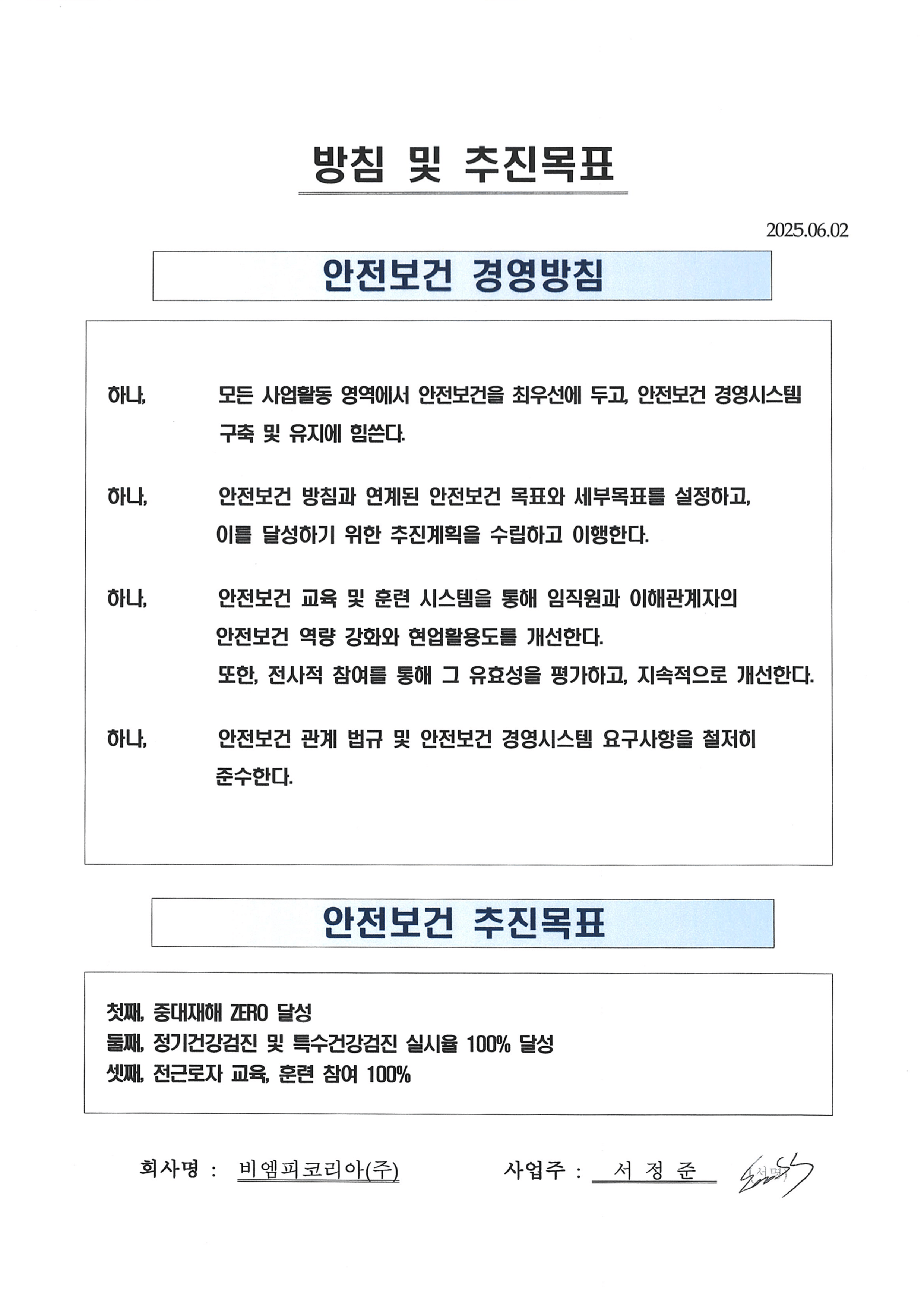 Safety and Health Management Policy and Goals
